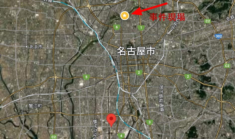こちらの画像上側の星印が事件現場です。下側の赤い印が容疑者の自宅です。容疑者の自宅と事件現場は直線距離で約10kmほどの距離になります。